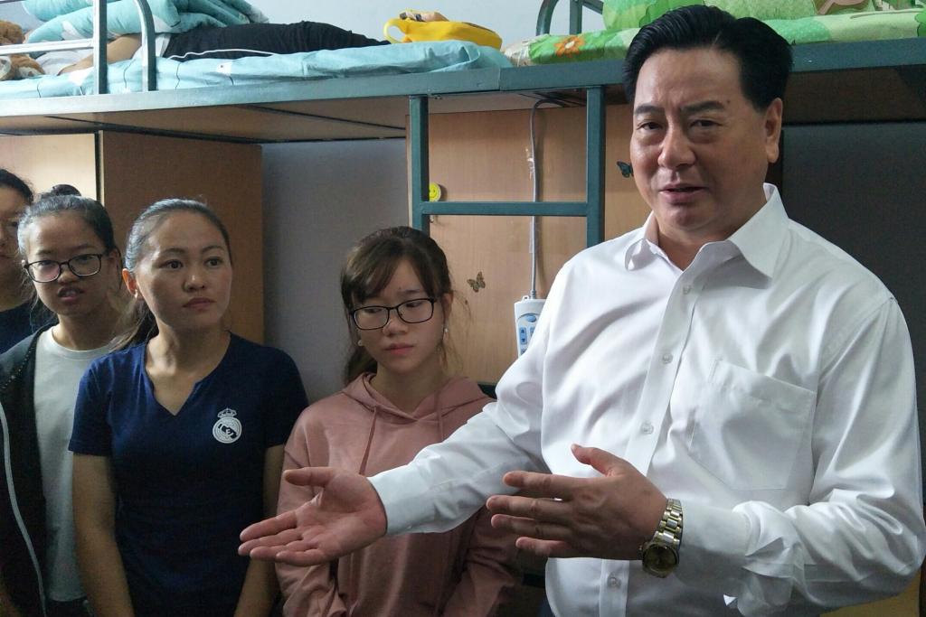 李元元董事长首先详细询问了新生的报到和后续管理工作安排,并对迎新工作中可能出现的问题做出了相应指导。随后,李元元董事长来到太阳成集团tyc151cc员工寝室,慰问入住公寓的新生,并与部分新生及家长亲切交谈。由于暑期宿舍翻修,部分新生宿舍收尾工作仍在继续,李董事长向新生表达了关怀和歉意。他表示,学校一直致力于改善员工宿舍环境,会尽快完成收尾工作,给同学们一个安全舒适的休息和学习环境。新生与家长们为董事长无微不至的关怀所感动,纷纷表示能够理解和支持学校的安排。