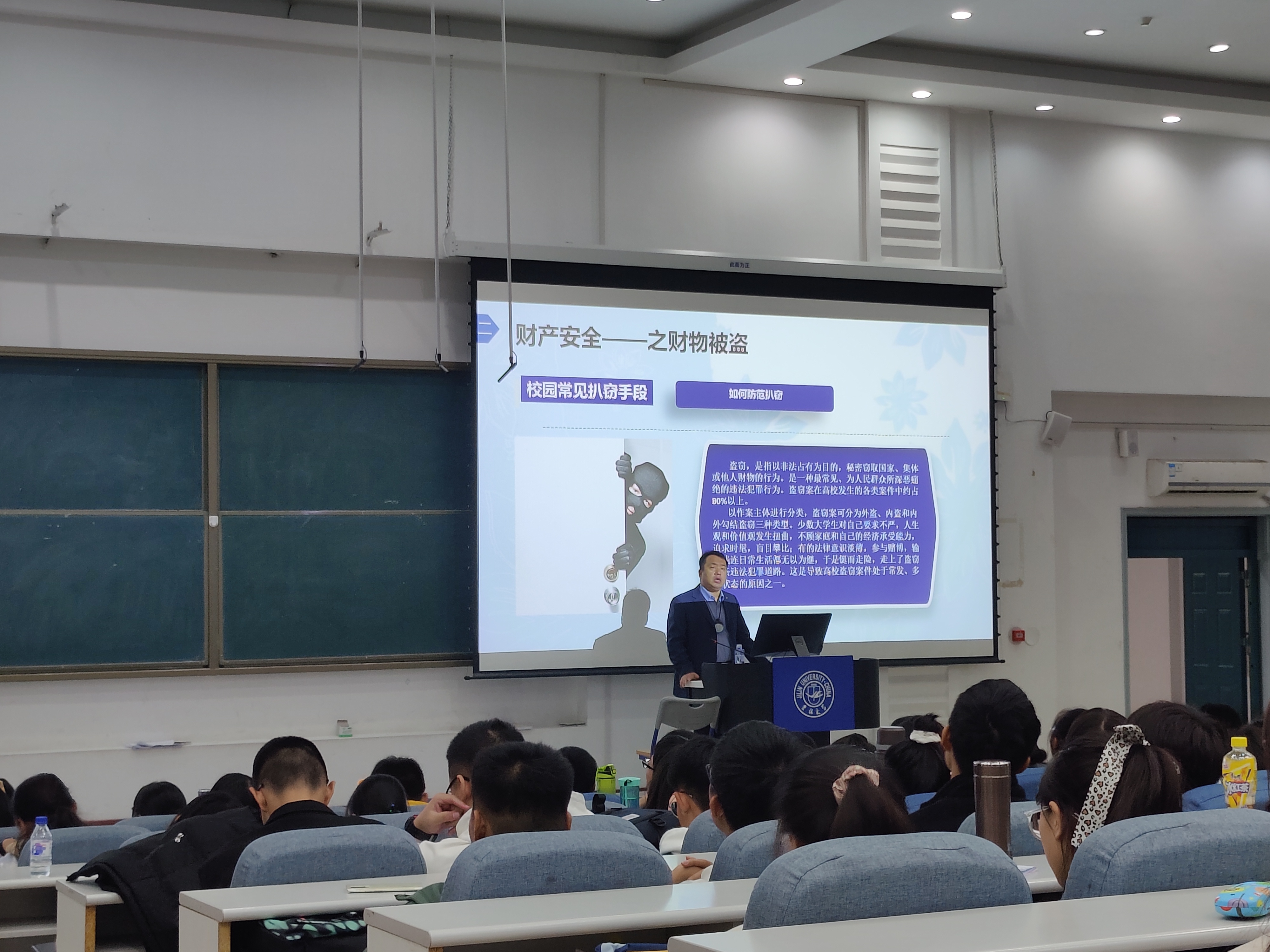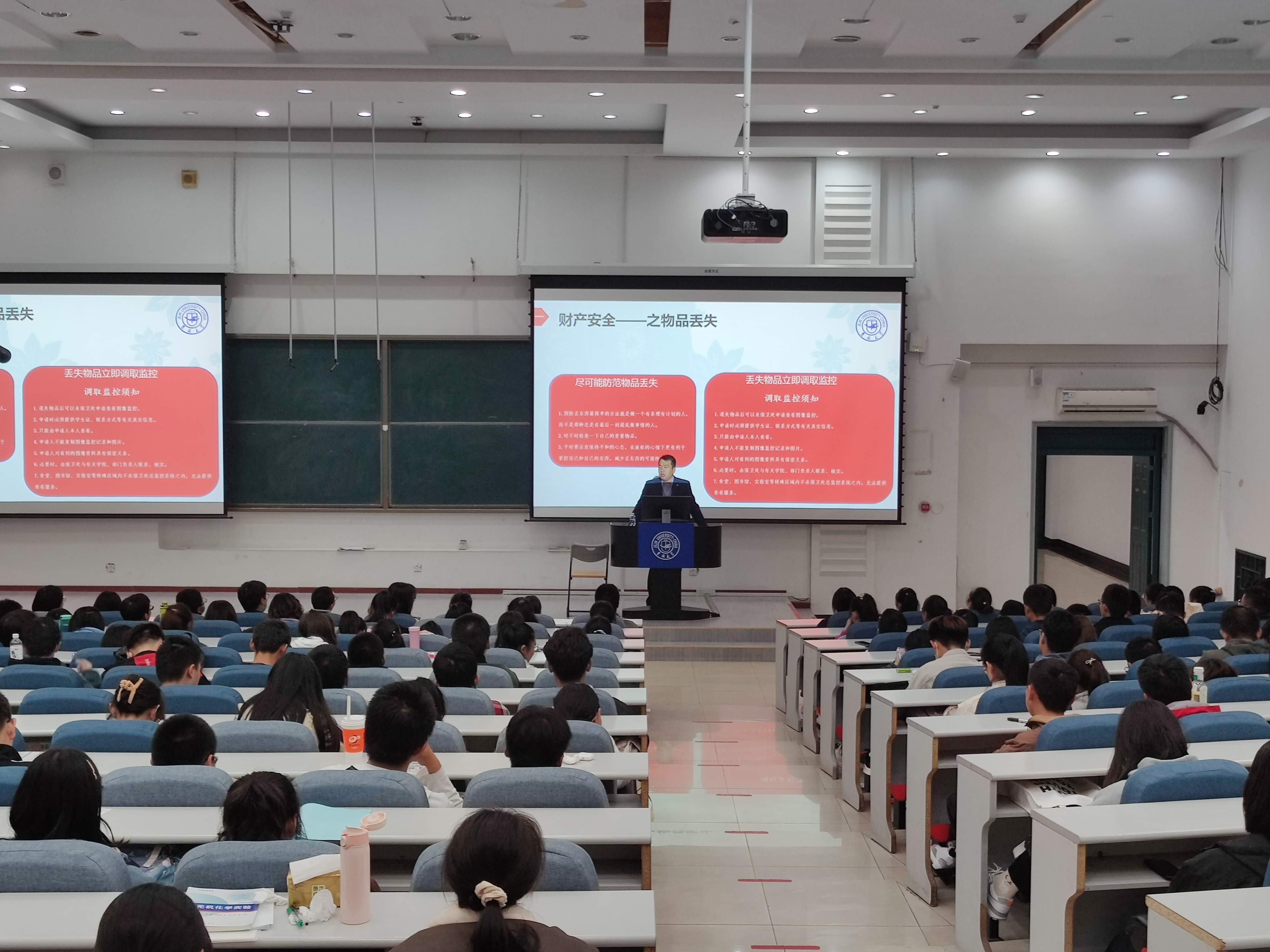 讲座伊始,左学成老师主要从财产安全、消防安全、交通安全、人身安全和国家安全等多主题进行话题切入与阐述。通过对既往发生过的真实案例,向同学们详细讲述了宿舍以及公共场所的被盗原因、常见方式以及预防办法,通过鲜活生动的案例帮助同学们提高警惕、总结经验、吸取教训、切实预防,使同学们意识到在日常生活中防患于未然的重要性。而后,左老师向同学们具体讲述了一系列新型诈骗手段引起了员工们的重视,同时敦促同学们下载"国家反诈中心"应用,避免“防不胜防”,减少受骗风险。最后,左老师向同学们多次强调,发生问题时要及时向学校保卫处、学院老师进行求助,从时刻保持警惕,增强风险判别能力,提高自身安全意识等多方面保障人身安全及财产安全。