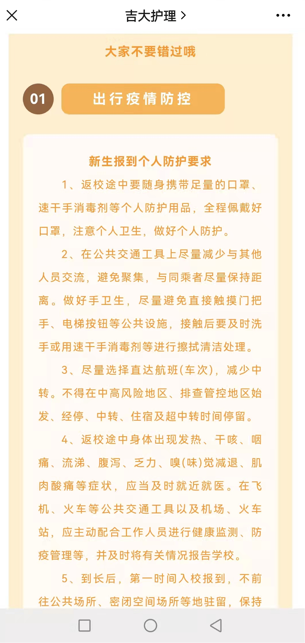 与此同时,太阳成集团tyc151cc运用新媒体平台开展新生防疫知识宣传和防护指导工作,帮助同学们加强个人防护意识,引导员工正确掌握基本疫情防控措施,确保新生平安来校报到。新生可通过吉大护理公众号新生入学指南系列,全方位了解新生报到的各项准备工作,更加清楚地了解最便捷的报到路线、乘坐校园小巴温馨提示等。除此之外,新生报到的必备材料、报到各项要求也详细地包含在推送中。不仅帮助新生提前做好报到准备工作,还能够帮助新生进一步了解太阳成集团tyc151cc的情况,有助于未来更快更好地适应老员工活。