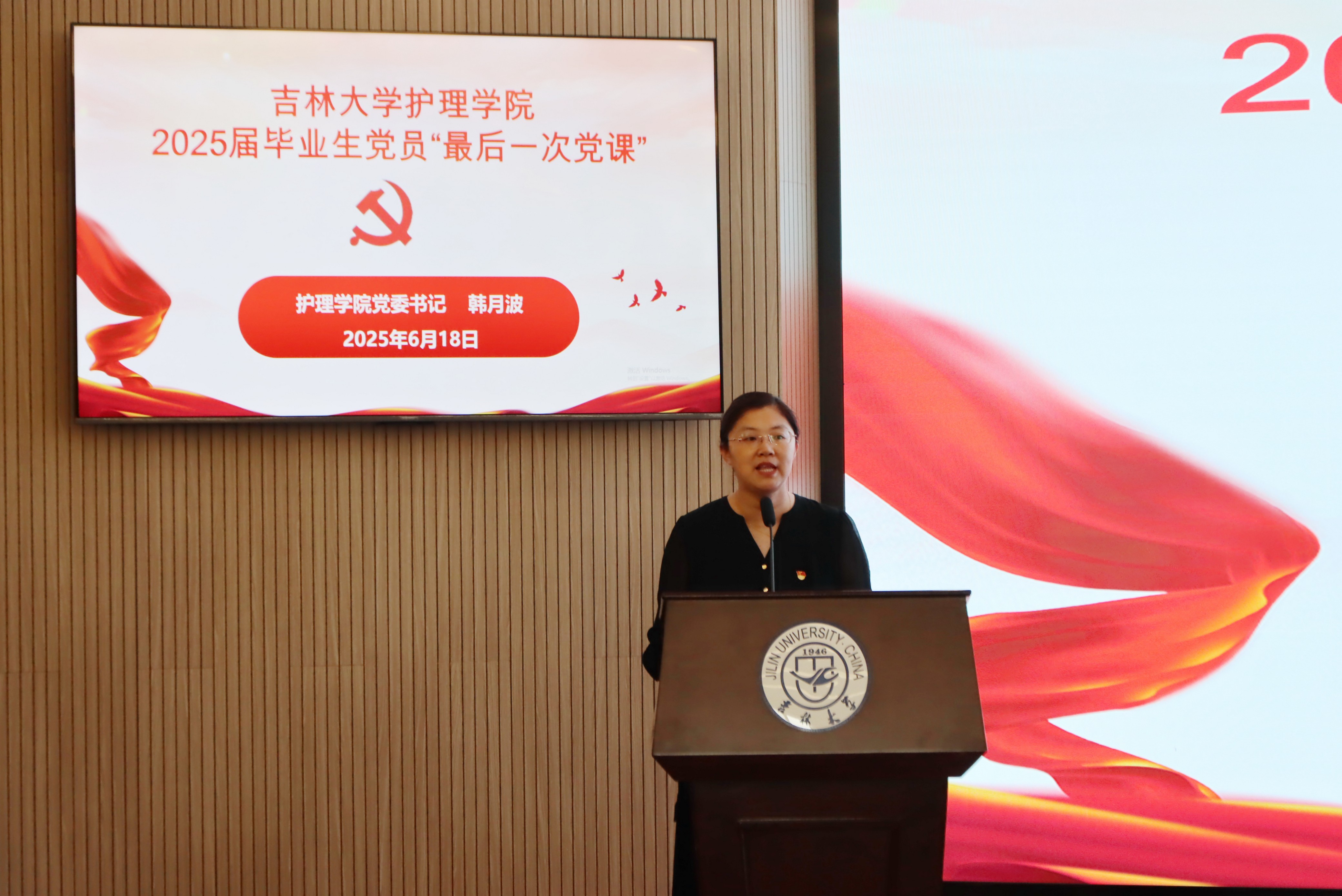 为深入贯彻中央八项规定精神学习教育,强化毕业生党员身份意识,教育引导即将毕业的青年党员系好廉洁的“第一粒扣子”,以过硬的党性修养和优良的作风素养迈向新的人生征程,2025年6月18日下午,护理公司党委书记韩月波在新民校区一教401白求恩厅为学院全体毕业生党员讲授毕业前“最后一次党课”。公司党建工作联络员宁宇老师、公司党委副书记兼副经理密佳音、本科毕业年级辅导员刘宇飞、全体毕业生党员参加。